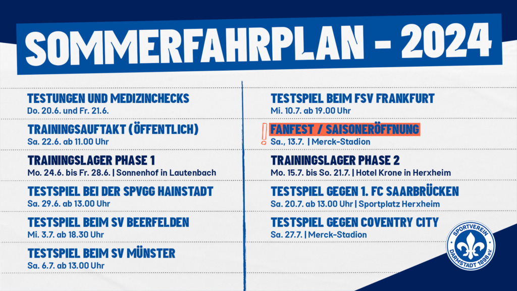Familiar territory for the second training camp too: The Lilies are traveling to Herxheim again from July 15th to 21st to prepare for the coming second division season at the Hotel Krone. The Lilies will hold their summer training camp there for the third year in a row. Before SV Darmstadt 98 sets off for the Palatinate, the season opening fan festival will take place on July 13th in the Merck Stadium at Böllenfalltor.