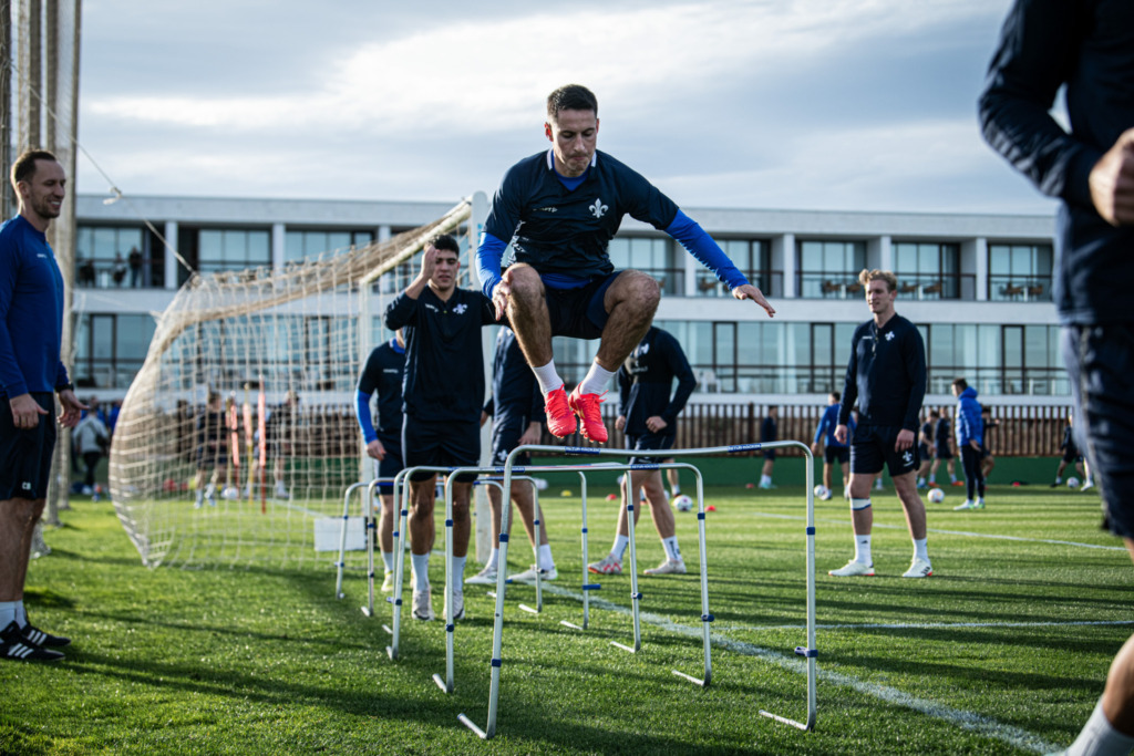 Nach Hotelankunft und Mittagessen betraten die Lilien am Nachmittag dann auch direkt das satte Grün des hoteleigenen Trainingsplatzes und starteten mit Stabilisation, Sprüngen und verschiedenen Passformen ganz offiziell in die kurze Wintervorbereitung.