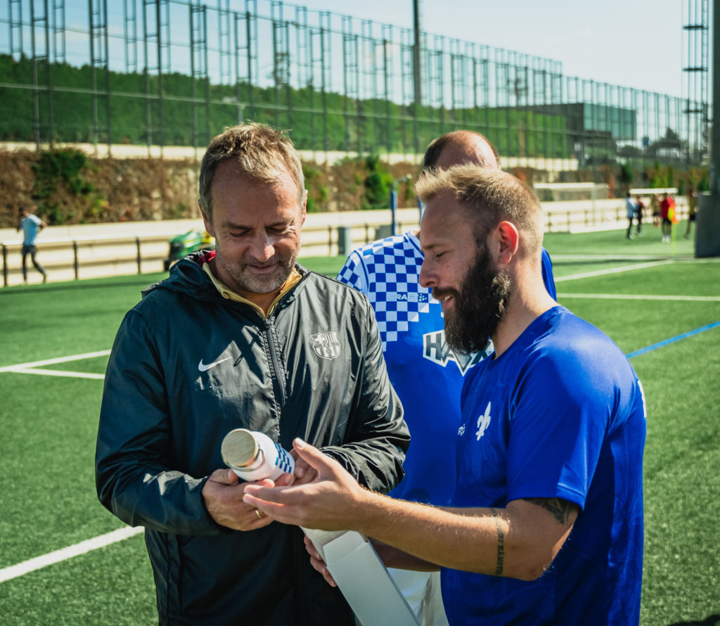 Even before kick-off, the traditional Lilien team was expecting a special highlight: Hansi Flick, former national coach and current head coach of FC Barcelona, welcomed the team to the Spanish first division club’s sports grounds and exchanged ideas with the players. But the encounter had even more surprises in store. Both teams gave each other gifts and exchanged souvenirs: the Lilies received pins with the Barcelona coat of arms, a book with all the Barcelona players, a signed ball and a traditional pennant. The hosts, for their part, received pennants and pins as well as special drinking bottles with the logos of both clubs and a three-liter Krombacher bottle with the club’s coat of arms and the date of the match day.