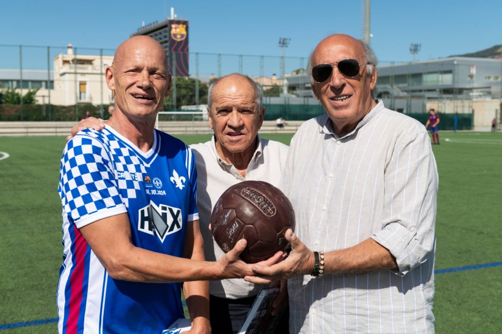 Schon vor dem Anpfiff erwartete die Traditionsmannschaft der Lilien ein besonderes Highlight: Hansi Flick, ehemaliger Bundestrainer und aktueller Cheftrainer des FC Barcelona, begrüßte das Team auf dem Sportgelände des spanischen Erstligisten und tauschte sich mit den Spielern aus. Doch die Begegnung hielt noch weitere Überraschungen bereit. Beide Teams beschenkten sich gegenseitig und tauschten Andenken aus: Die Lilien erhielten Anstecker mit dem Barcelona-Wappen, ein Buch mit allen Barcelona-Spielern, einen signierten Ball und einen traditionellen Wimpel. Die Gastgeber bekamen ihrerseits Wimpel und Anstecker sowie spezielle Trinkflaschen mit den Logos beider Vereine und eine drei Liter große Krombacher-Flasche mit den Vereinswappen und dem Datum des Spieltages.