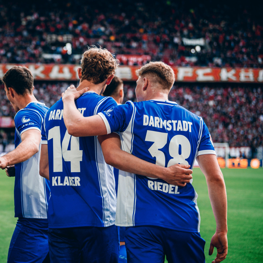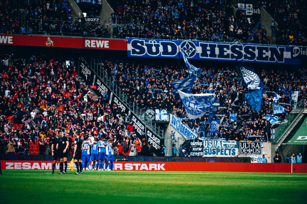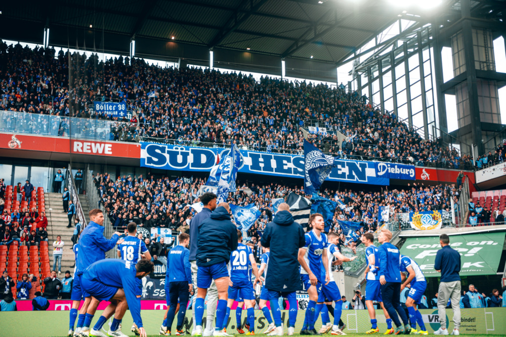 Auch zuvor auf dem Platz vor der Kurve entstanden Bilder, nach denen sich der gesamte Sportverein sowie seine Anhängerschaft so lange gesehnt hatten. “Ich freue mich sehr, dass wir der Stadt Darmstadt und unseren Fans mal wieder einen Bundesliga-Sieg geschenkt haben”, so der Cheftrainer. Die Eindrücke des vollen, blau-weißen Gästeblocks hatten dabei nicht nur Lieberknecht, sondern alle Darmstädter Protagonisten, die nach dem 2:0-Erfolg vor die Mikrofone traten, noch im Kopf. “In diesem Stadion vor so vielen mitgereisten Darmstadt-Fans zu gewinnen, tut uns und dem ganzen Verein gut”, freute sich Klarer und fügte begeistert an: “Es ist schon geil, wenn man vor der Kurve steht und der ganze Gästeblock bis oben randvoll mit blau-weißen Fans ist.” Dass sich 3.500 Lilien mit auf den Weg nach Köln machten, war dabei keine Selbstverständlichkeit. Schließlich mussten die Fans des SV 98 in dieser Saison schon so viel an Enttäuschung durchleben. Doch zeigte dieser eindrucksvolle Gästeblock einmal mehr den Zusammenhalt, der in diesem Verein herrscht.