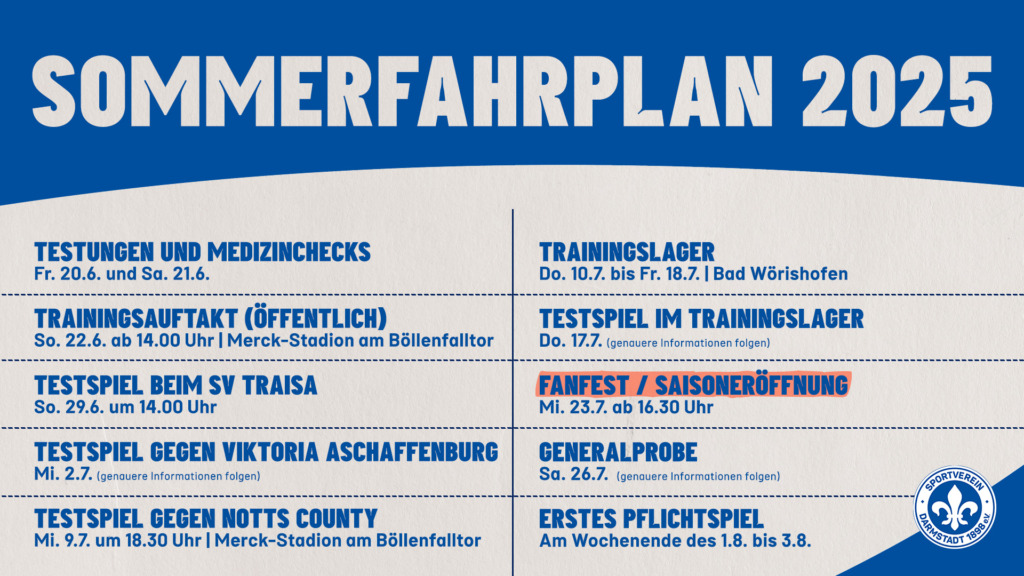 The training session at the Merck Stadium at Böllenfalltor is open to the public, and spectators are welcome. The first friendly match is scheduled for June 29th: At 2pm, the Lilies will face group league team SV Traisa. Another friendly match is planned for July 2nd against Viktoria Aschaffenburg. The exact venue is still to be determined. The match on July 9th has already been confirmed: At 6:30pm, the Lilies will host the traditional English club Notts County at the Merck Stadium at Böllenfalltor. This year’s SV 98 training camp will take place in the Allgäu region. From July 10th to 18th, the Lilies will be in Bad Wörishofen. The Lilies will be staying at the Parkhotel Residence and training will take place on the grounds of FC Bad Wörishofen. As part of the training camp, the South Hesse team will play a friendly match on July 17th.