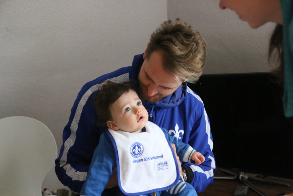Er fühlt sich wohl im Arm von Immanuel Höhn. Der kleine Glenn möchte am liebsten gar nicht mehr aufhören, mit dem Profi der Lilien zu kuscheln. Kein Wunder, die Nummer 21 des SV Darmstadt 98 hat ihm ja auch das allererste neu produzierte Lilien-Lätzchen mitgebracht und direkt umgebunden. „Gegen Einheitsbreit!“, steht dort drauf. Und es steht ihm, dem Kleinen, der am 23.03.2019 das Licht der Welt erblickte.