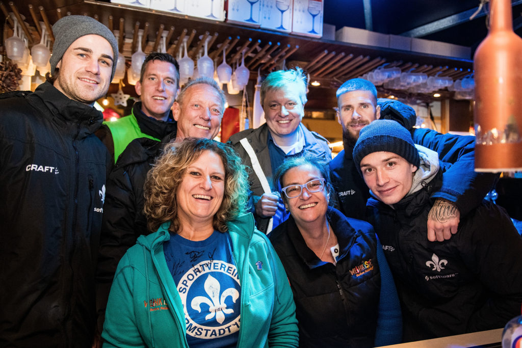 Die Lilien-Profis Yannick Stark, Tobias Kempe und Marvin Mehlem haben zum Auftakt des Darmstädter Weihnachtsmarktes in „Felderhoffs Glühweinkiste“ auf dem Luisenplatz Glühwein für den guten Zweck ausgeschenkt. Im Rahmen des Projekts „Echo hilft!“ lockten sie zahlreiche Fans und Besucher an, die zusammen das typisch weihnachtliche Heißgetränk bei lockeren Gesprächen genossen.