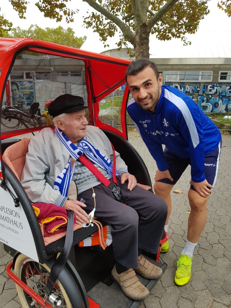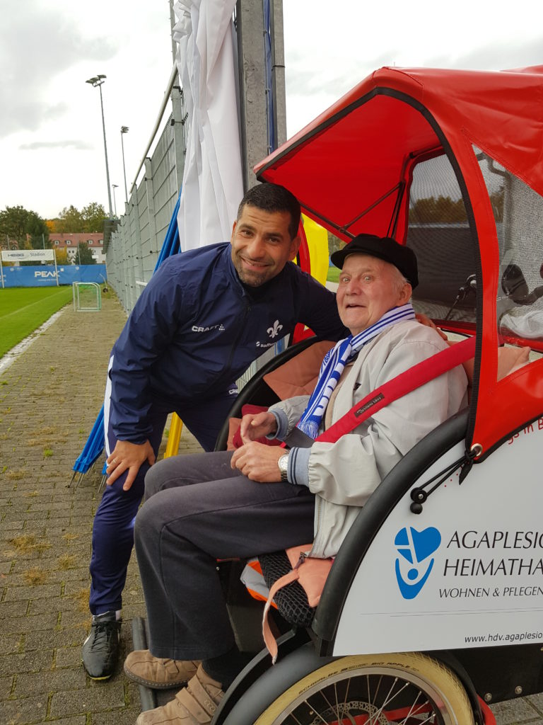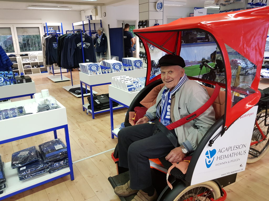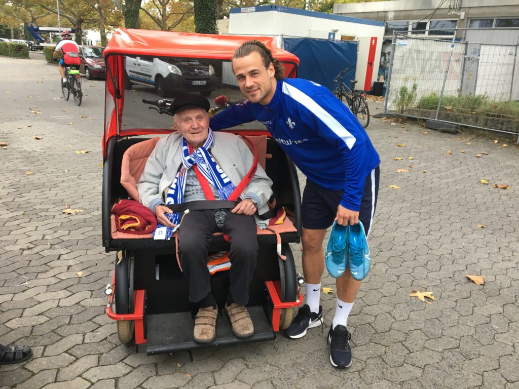Die Profis des SV Darmstadt 98 einmal live erleben? Ein Wunsch, der für Günther Haas in ganz besonderer Art und Weise in Erfüllung ging. Der Bewohner des Agaplesion Heimathauses wurde per Rikscha zum Trainingsgelände der Lilien gefahren. Warm eingepackt und mit einem Fan-Schal des SV 98 ausgestattet machte es sich Haas in der Rikscha gemütlich. Kai Mezger, Leiter Controlling des HDV Darmstadt, trat mächtig in die Pedale und kutschierte den Lilienfan quer durch Bessungen zum Merck-Stadion am Böllenfalltor.