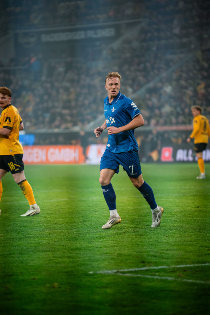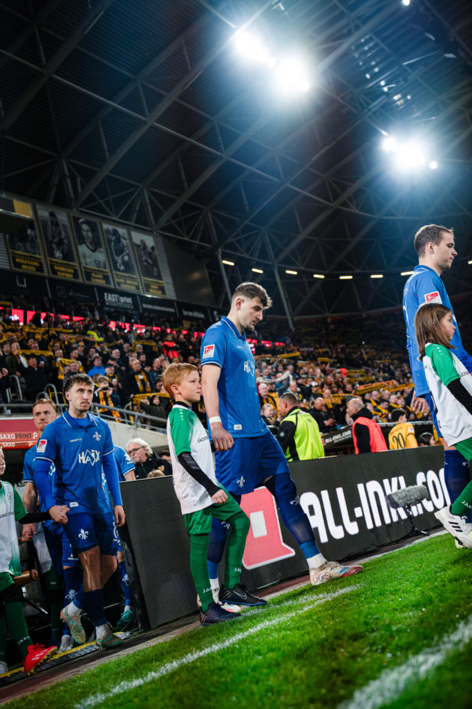 In der Anfangsviertelstunde der Partie bei Dynamo Dresden begegneten sich beide Teams zunächst auf Augenhöhe mit ausgeglichenen Spielanteilen. Die Südhessen erarbeiteten sich erste vielversprechende Offensivaktionen, welche die Gastgeber häufig nur durch Foulspiele unterbinden konnten. Den ersten gefährlichen Abschluss der Begegnung verzeichneten schließlich ebenfalls die Lilien: Nach einer Flanke von Raoul Petretta nahm Niklas Schmidt den Ball direkt aus der Luft und zwang Schreiber im Tor der Dresdner zu einer Parade (20.).
