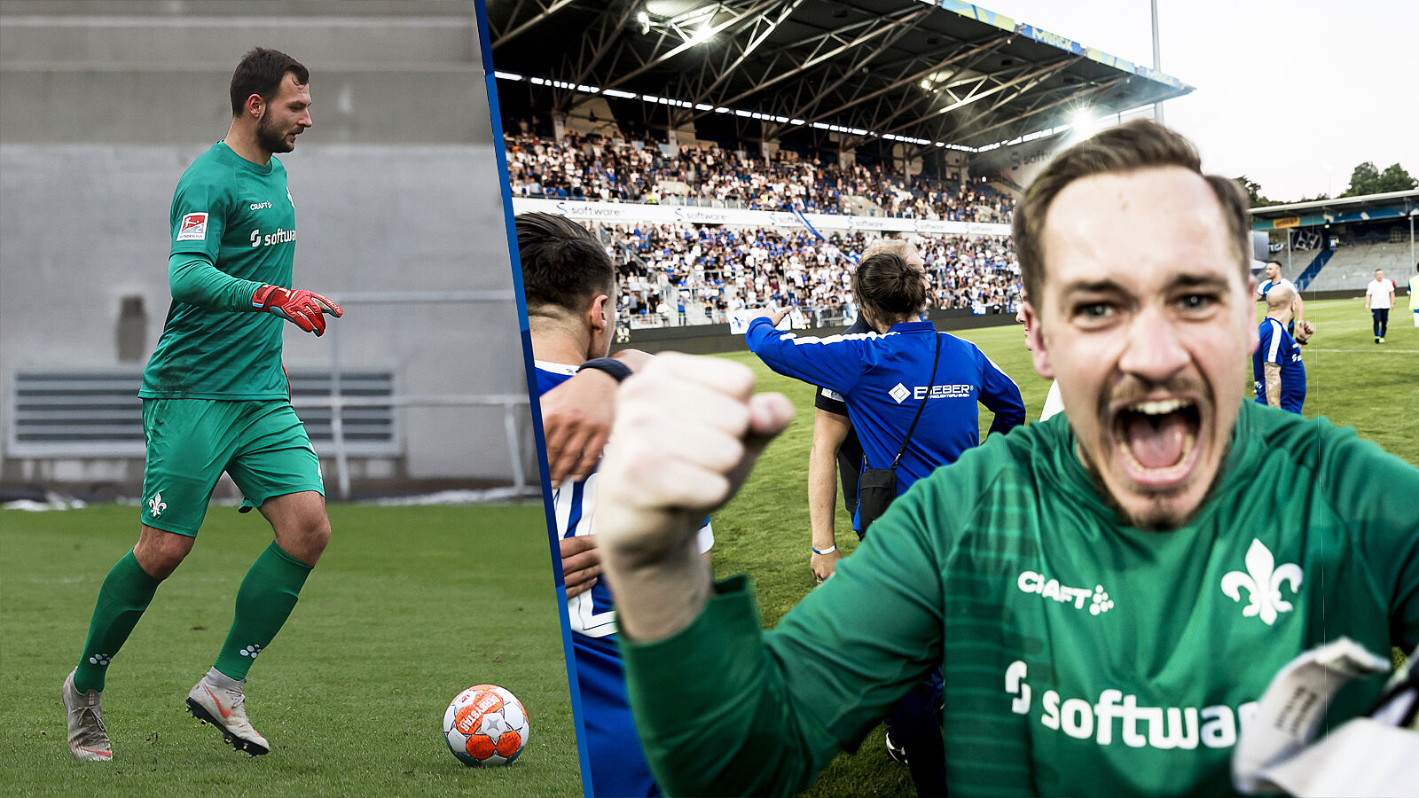Viel im Rampenlicht stand er bislang nicht, auch in einem Pflichtspiel kam er für die Lilien noch nicht zum Einsatz. Steve Kroll, er ist dritter Torhüter beim SV Darmstadt 98. Und trotzdem fühlt er sich wohl am Böllenfalltor. „Die Mannschaft ist ein geiler Haufen, wir harmonieren alle sehr gut miteinander“, betonte er in einer Medienrunde am Mittwoch (1.3.). Seine Aufgabe sei es aktuell, im Training stets Vollgas zu geben. „Es ist wichtig, dass ich Marcel Schuhen und Alex Brunst bestmöglich unterstütze und wir uns gegenseitig pushen“, so der 25 Jahre alte Vater zweier Söhne, der neben seiner Fußballerkarriere bereits an einem zweiten Standbein arbeitet und einen Plan B in der Tasche hat: „Ich habe sowohl eine Ausbildung zum Fitnesstrainer als auch zum Ernährungsberater gemacht.“