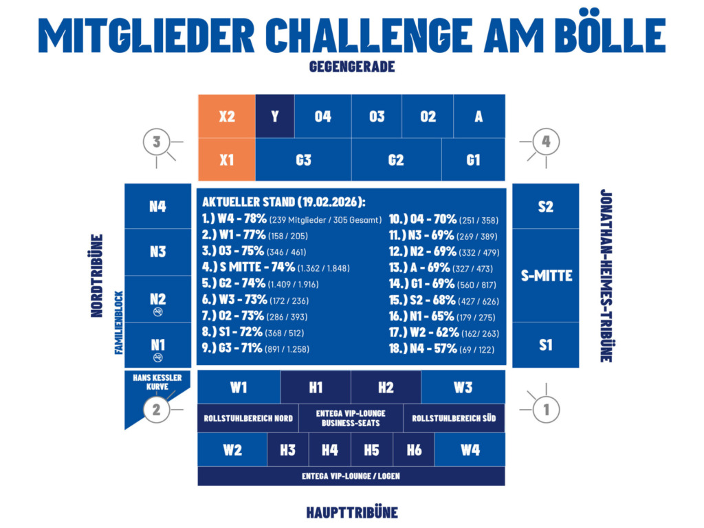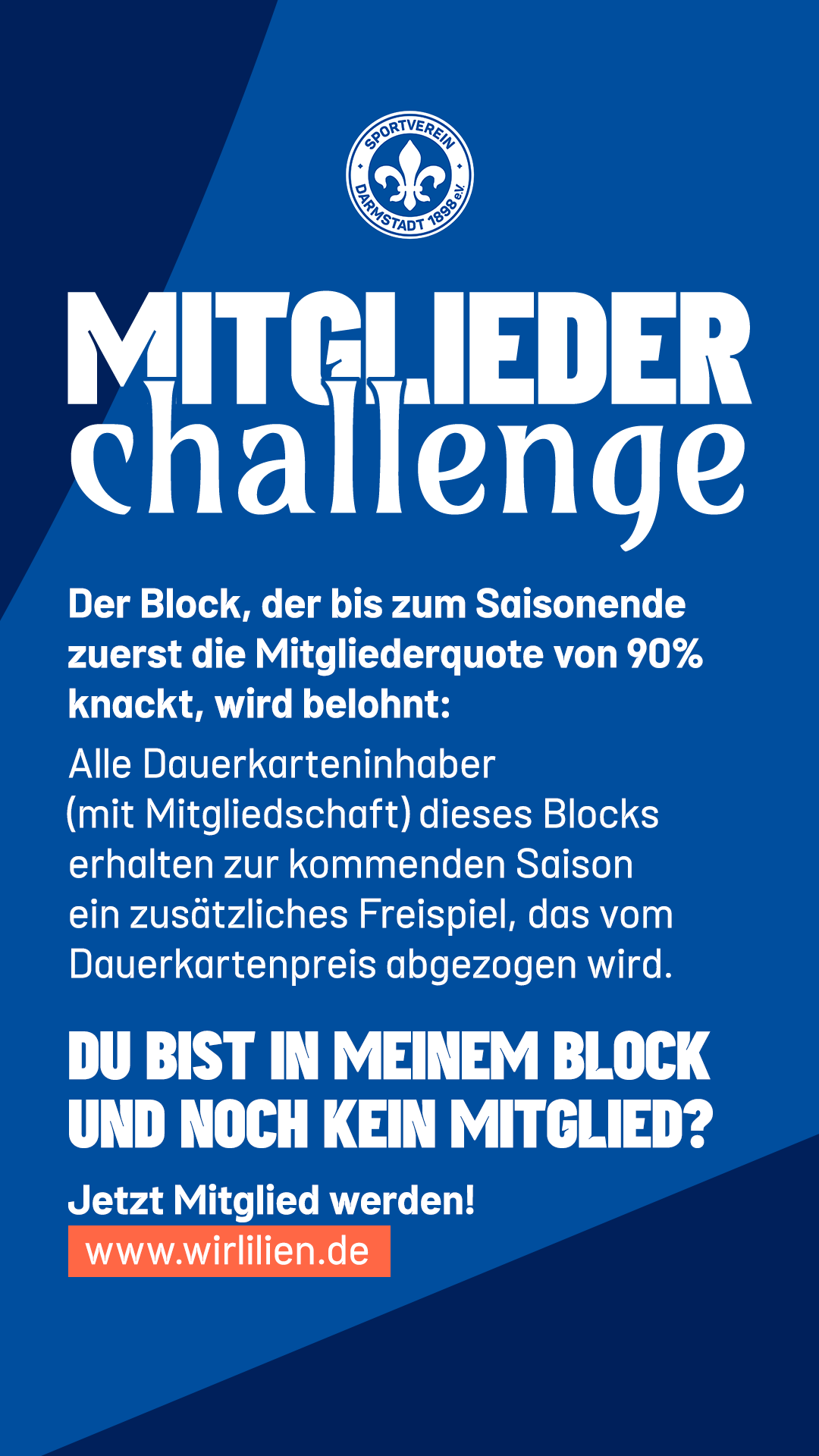 Auf dem Weg zu 18.980 Mitgliedern suchen die Lilien den „Mitglieder-Block“ im Merck-Stadion am Böllenfalltor: Welcher Stadionbereich erreicht als erster eine Mitgliederquote von mindestens 90 Prozent? Zu Beginn des Jahres 2026 starten alle Blöcke nahezu auf Augenhöhe. Der Block, der die 90-Prozent-Marke bis zum Saisonende zuerst knackt, wird belohnt: Alle Dauerkarteninhaber (mit Mitgliedschaft) dieses Blocks erhalten zur kommenden Saison ein zusätzliches Freispiel, das vom Dauerkartenpreis abgezogen wird.