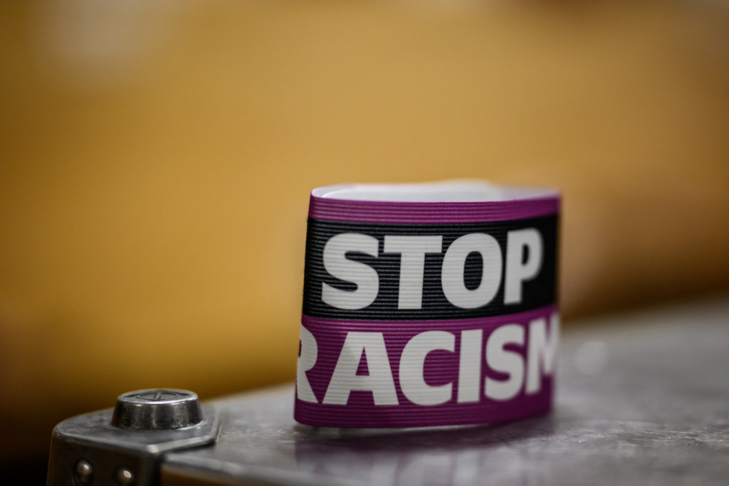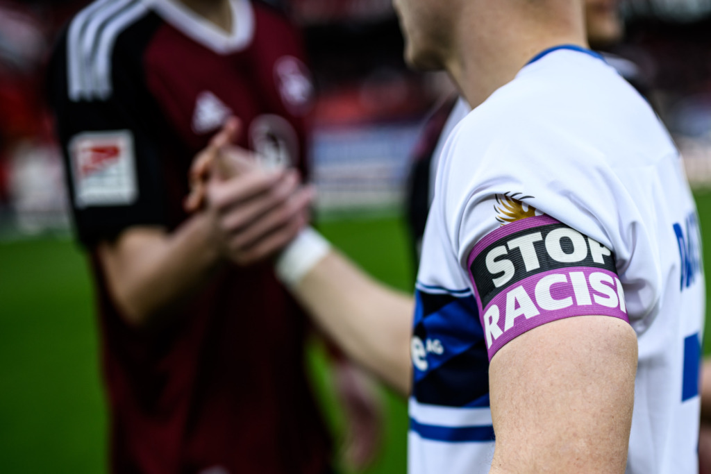 NUREMBERG, GERMANY - MARCH 31: The Stop Racism slogan is seen on the captain's armband prior to the Second Bundesliga match between 1. FC Nürnberg and SV Darmstadt 98 at Max-Morlock-Stadion on March 31, 2023 in Nuremberg, Germany. (Photo by Sebastian Widmann/Bundesliga/Bundesliga Collection via Getty Images) 06.04.2023 / Verein