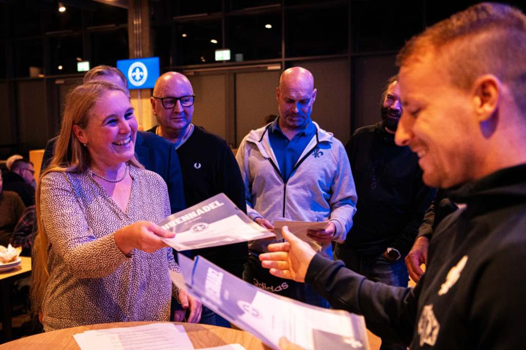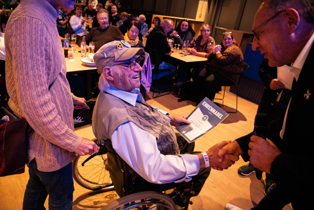 What followed was a delicious dinner together. Fritsch then asked the captain of the Lilies, Fabian Holland, to come forward. The injured captain of SV 98 had long since mingled with the members and was available for stimulating conversations as well as requests for photos and autographs. Together, Fritsch and Holland honored long-standing members and thanked them for their remarkable loyalty to the club. On this evening of honour, Lilien members were honoured for 25, 40, 50, 60 and even 70 years of membership.